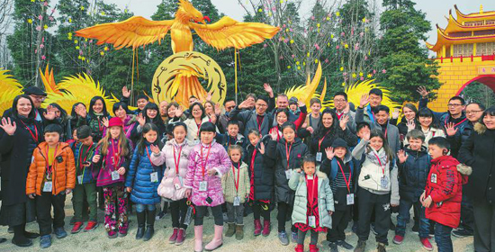 在成都金沙太阳节灯会的太阳神鸟的标志下,20个中外家庭的成员留下特别的合影。