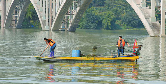 河长制实施后,武胜县组建成立了专业水上保洁队,分江段对嘉陵江城区水域进行全天候保洁,保护水环境。周昌林 摄(视觉四川)