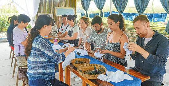 9月3日,外国友人正在蒲江县明月村学习染布技法。记者 郝飞 摄