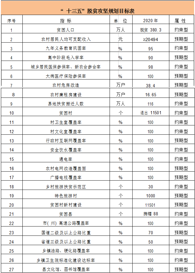 大目标“时间表”出来了,细化目标又咋样?《规划》明确了“目标表”:到2020年,易地扶贫搬迁人数达到116万人;建设乡村旅游扶贫示范区30个,力争建设特色旅游村1000个;城乡居民医保参保率、新农合参合率达到98%;农村居民人均可支配收入不低于20494元……