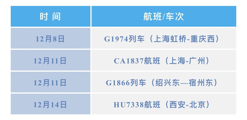 搭乘过以下交通工具的来(返)川人员,第一时间主动向社区或居(村)委会、单位或入住酒店报备旅居史,配合做好相关防控工作。