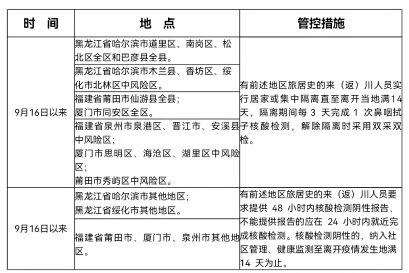9月18日以来从澳门特别行政区的来(返)川人员,需提供48小时内核酸检测阴性报告,不能提供报告的应在24小时内就近完成核酸检测。核酸检测阴性的做好健康监测至离开澳门满14天。