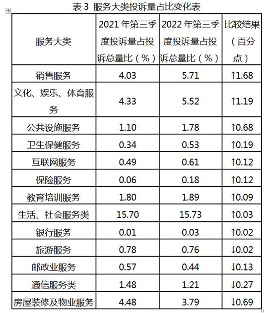 与2021年同期相比,销售服务类、文化、娱乐、体育服务类及公共设施服务类等消费投诉呈上升趋势,而邮政业服务类、通信服务类和房屋装修及物业服务类等呈下降趋势。(赵祖乐)