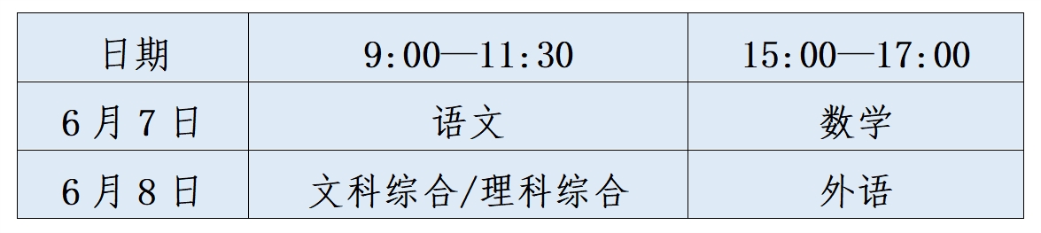 (1)全省高考(一类模式高考除外)于6月7日—8日统一组织进行。各科目考试时间(北京时间)安排如下: