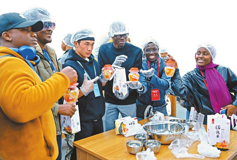 At the pickle exhibition area of Sichuan Lao Tan Zi Food Co., Ltd., Li Ande (transliteration), a Gabonese student at Sichuan Agricultural University, excitedly opened the lid of a pickle jar and discovered that the jar contained various types of fruit pickles, in addition to traditional pickled radishes and pickled cowpeas. "Truly fascinating! I've been studying in Sichuan for six years, and this is the first time I've seen how Sichuan pickles (paocai in Chinese) are actually made," said Li Ande. He and his companions also put on gloves to experience making tiaoshui paocai (quick-pickled pickles), feeling the industrial strength behind Sichuan's culinary delights.