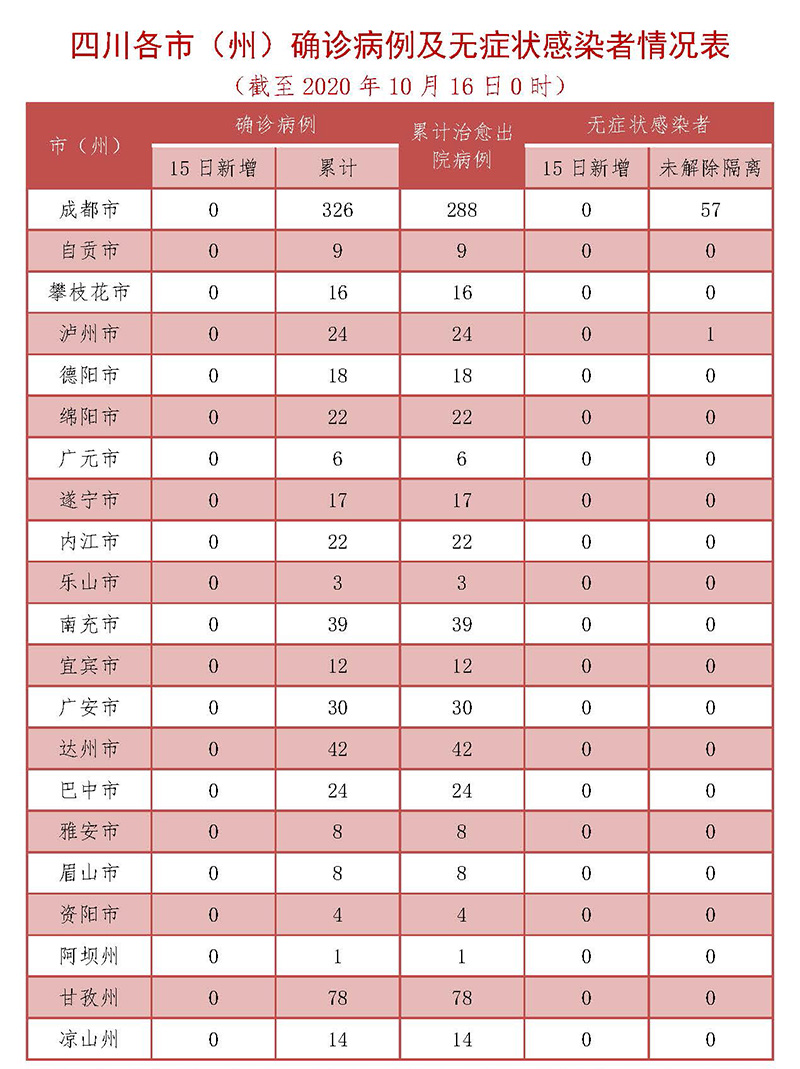 四川省新型冠状病毒肺炎疫情最新情况(10月16日发布)
