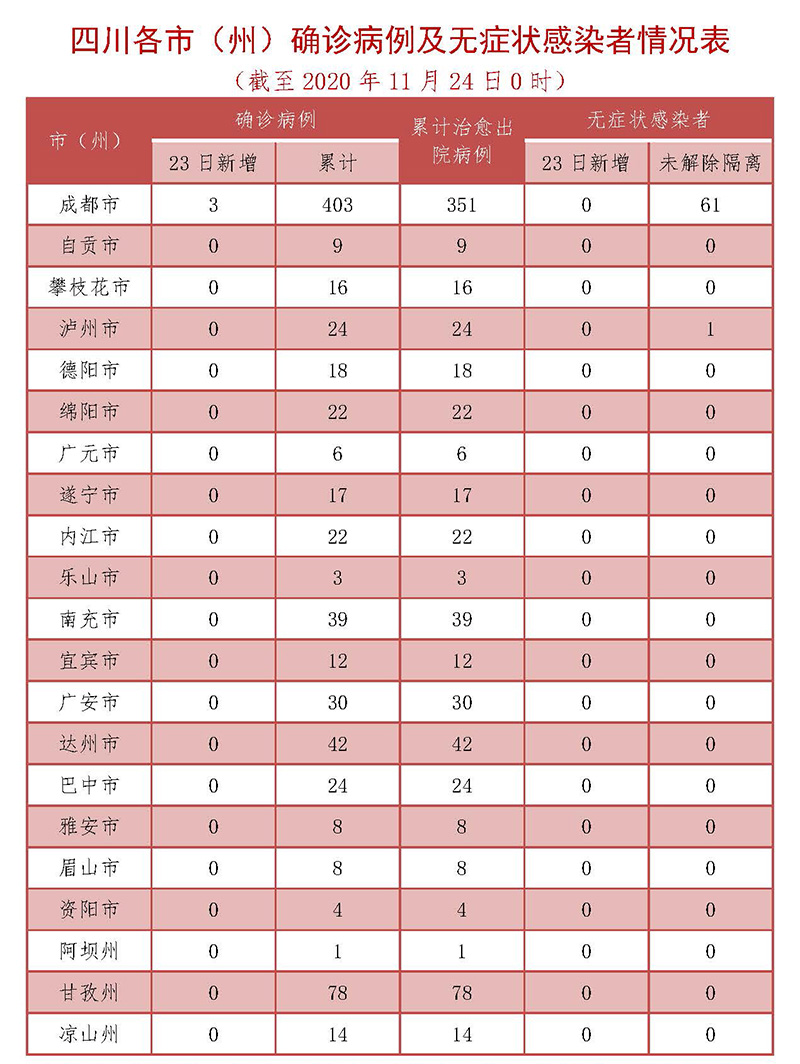 四川省新型冠状病毒肺炎疫情最新情况(11月24日发布)