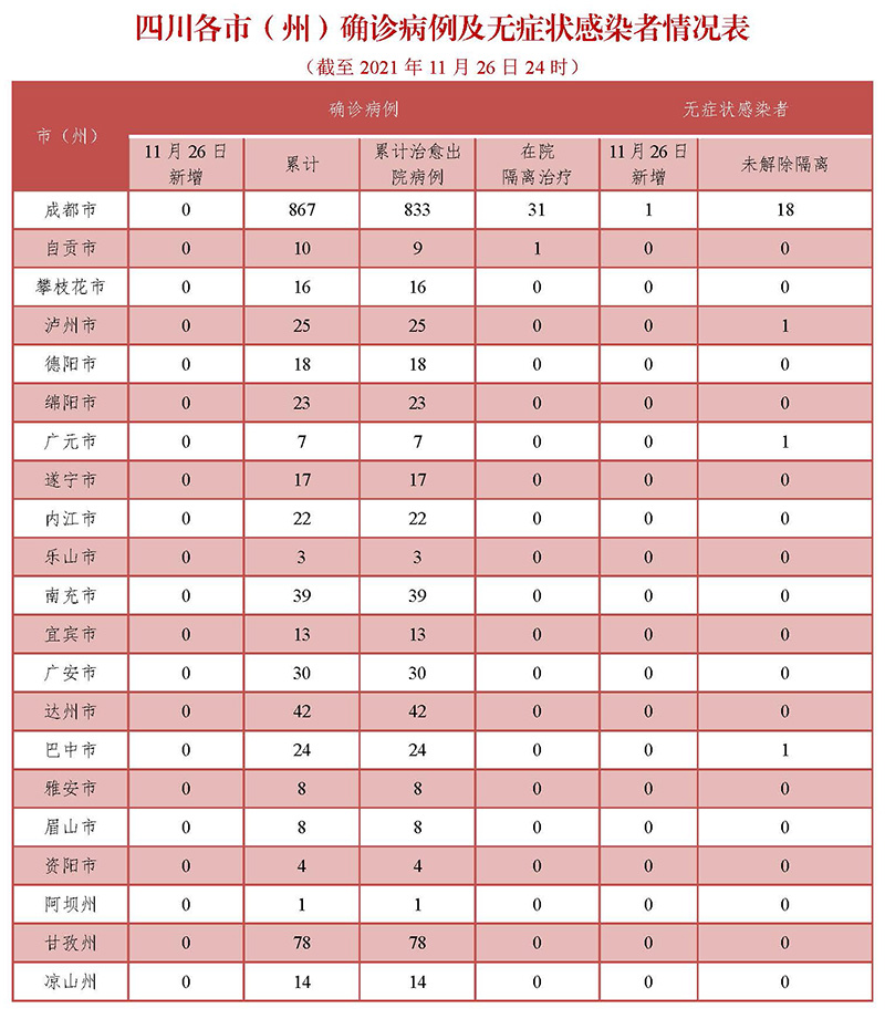 四川省新型冠状病毒肺炎疫情最新情况(11月27日发布)