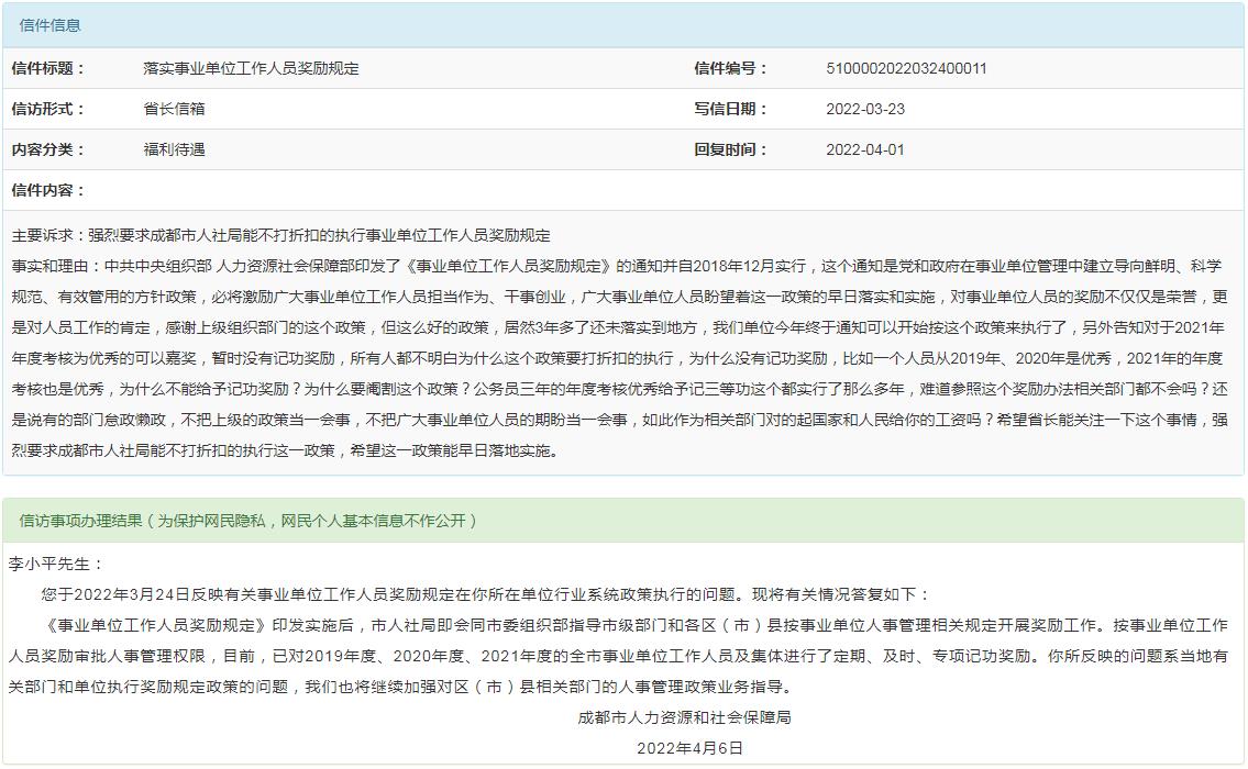 主要诉求:强烈要求成都市人社局能不打折扣的执行事业单位工作人员奖励规定