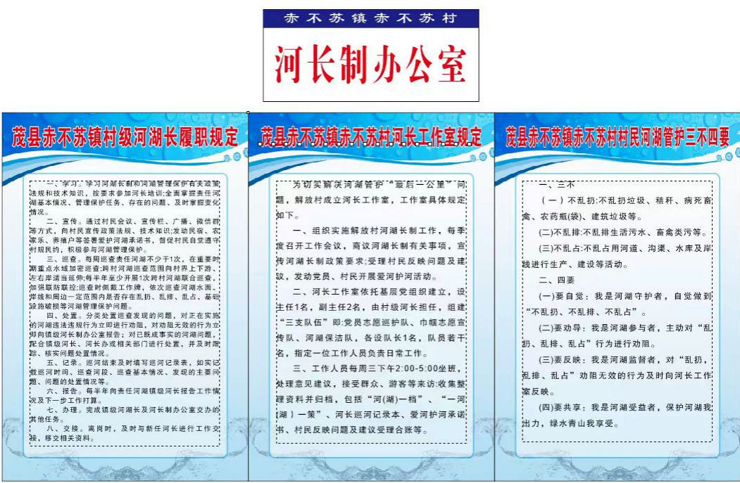 赤不苏村以党建引领为核心,充分发挥基层党组织的战斗堡垒作用,设置河长工作室。河长工作室依托基层党组织建立,设主任1名,副主任2名,由村级河长担任,组建“三支队伍”,其中:党员志愿巡护队队员10人、巾帼志愿宣传队5人、河湖保洁队5人,各设队长1名,指定一位工作人员负责日常工作,开展河湖宣传、保洁、监督等工作。