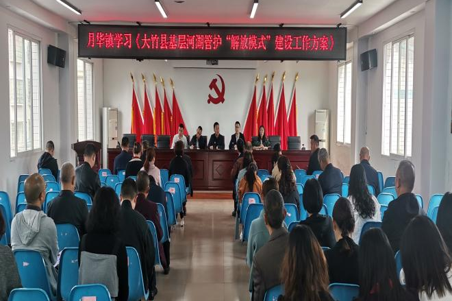 大竹县月华镇位于城东北部,总人口3.04万人,常住人口1.2万人。下辖8个村1个社区,74个村民小组和6个居民小组。镇党委下设15个党支部(党委、党总支),现有党员972名。为了持续提升辖区内河湖水环境,月华镇学创结合开展河湖管护“解放模式”推广并实践。