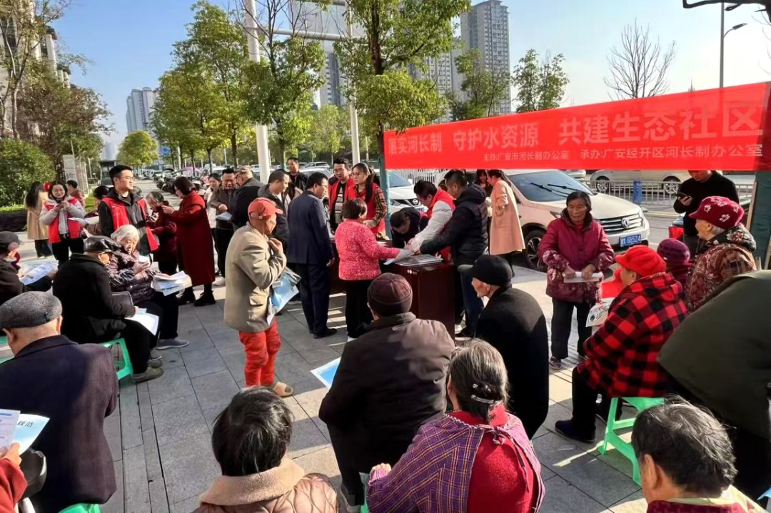11月20日,广安市河长制办公室联合广安经开区河长制办公室在奎阁街道台子社区开展以“落实河湖长制、守护水资源、共建生态社区”为主题的河湖长制“七进”进社区宣传活动。
