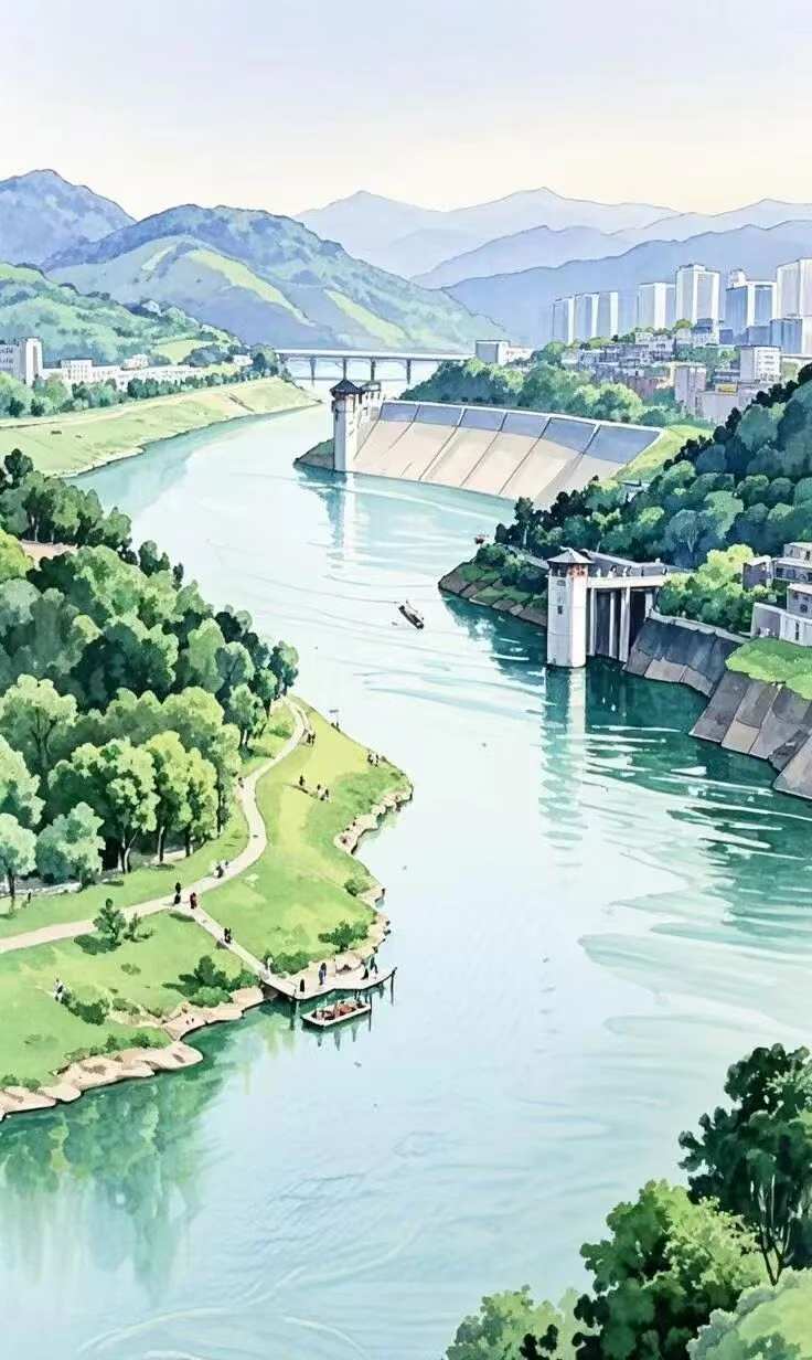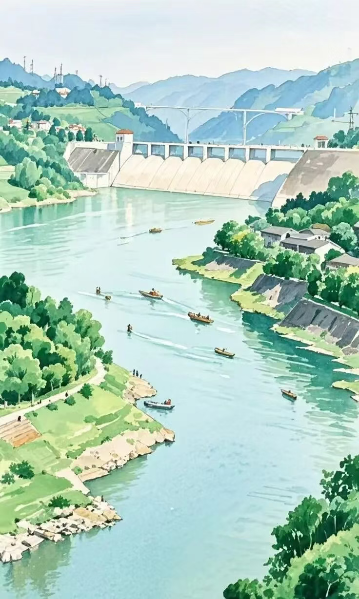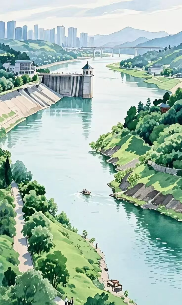 作品简介:第一幅画描绘了一处壮丽的水利工程景观。大坝巍峨横跨江面,拦截出一片开阔水域。江面上小船悠悠,或行或泊,尽显闲适。两岸青山绿树环绕,点缀着错落的房舍,远处山峦与输电塔相映,展现出自然与现代工程的和谐之美,传递出宁静祥和的氛围。第二幅画作展现了城市与水利工程交融的画面。大坝矗立江边,坚固雄伟,一侧连接着郁郁葱葱的岸坡,另一侧是宽阔的江面。江中小船行驶,泛起涟漪。远处高楼林立,桥梁飞架,背后山峦起伏,将现代都市的繁华与自然山水的秀丽完美结合,呈现出独特的城市水利风光。第三幅画呈现了富有生机的江景与水利设施景象。大坝与附属建筑临江而立,江水蜿蜒流淌,水面上船只穿梭。岸边绿树成荫,步道上行人悠然,充满生活气息。远处山峦与城市建筑相互映衬,桥梁横跨江上,体现了人与自然和谐共处,洋溢着惬意的生活氛围。