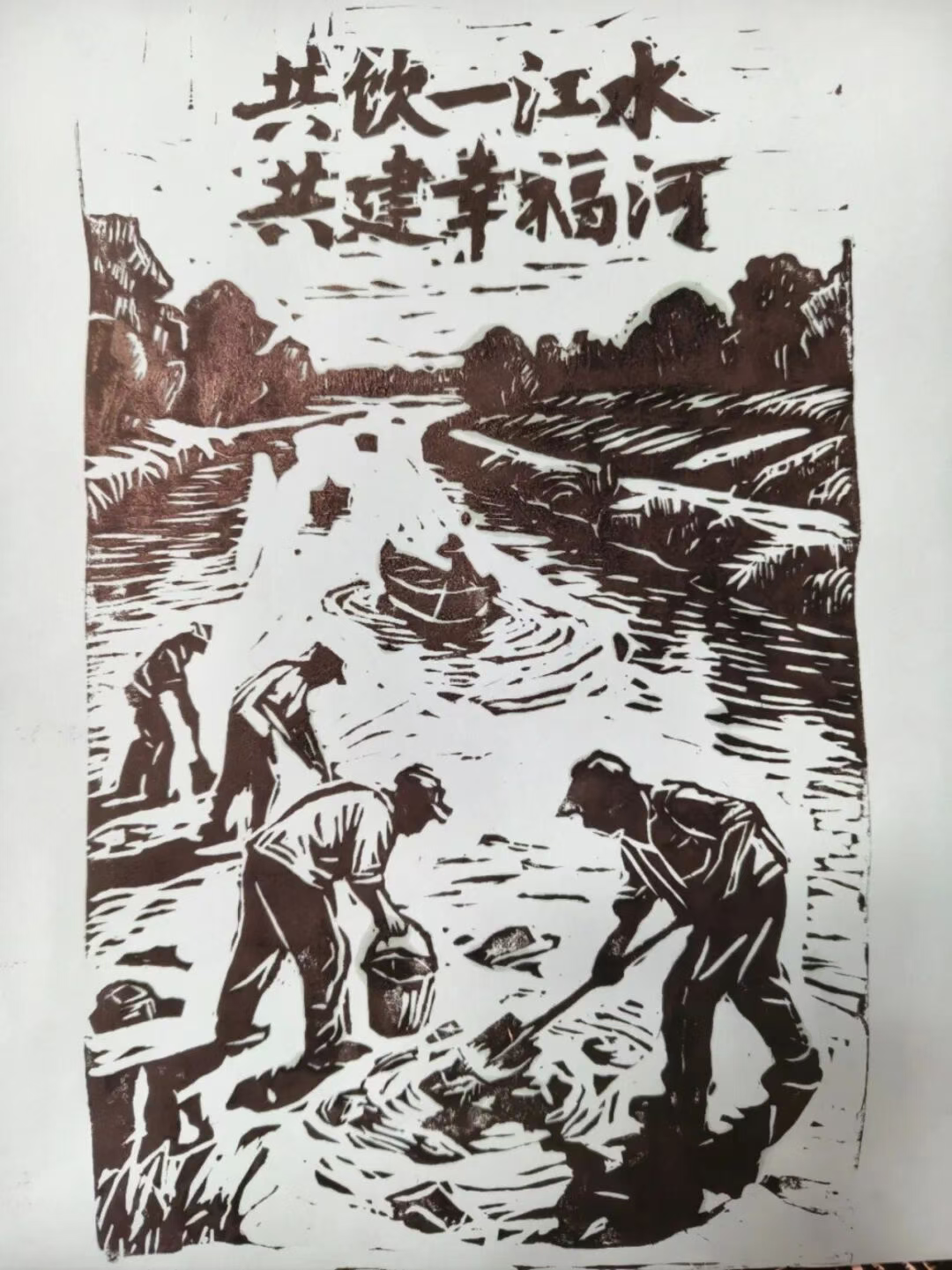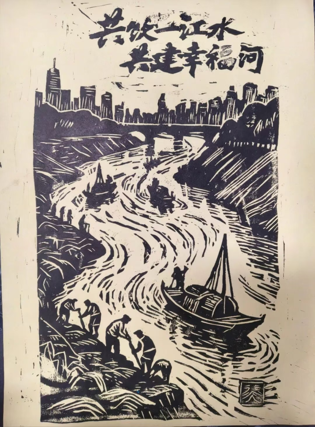作品简介:这幅版画以河流及其沿岸景象为主题,展现了人与自然和谐共融的美好画面。画面上方,现代城市建筑隐约可见;河中船只穿梭,岸边人们辛勤劳作,传统生活方式跃然纸上。文字“共饮一江水,共建幸福河”强调了环境保护与共同发展的理念。整体风格简洁有力,黑白对比鲜明,传达了对美好生活的向往与追求。