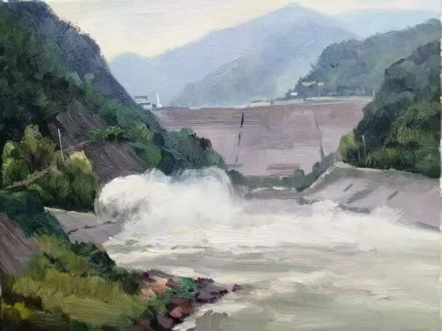 作品简介:这幅《蛟龙出坝》,是胡贵龙的现场写实写生佳作。创作时,胡贵龙伫立都江堰水利工程上游的紫坪铺水库大坝,岷江洪流奔涌眼前,那气贯长虹之势,恰似巨龙腾飞,激发创作灵感。紫坪铺水库,作为都江堰灌区关键调节枢纽,千年来默默润泽天府沃土,惠泽四川百姓。画作中,胡贵龙以磅礴笔触,绘出水口水流如蛟龙破壁而出,水花飞溅似银雪迸射,气势震天撼地。苍翠山峦环抱,水库大坝沉稳矗立,二者与汹涌水流相衬,既彰显水利工程驯服江河的雄浑力量,又传递其护佑民生、滋养一方的深远意义。这幅作品,是艺术与现实的交融,将自然伟力、工程壮举与家国情怀凝于画布,借灵动笔触与厚重色彩,诉说对天府大地的深情,对水利福民的礼赞,是兼具艺术价值与精神内涵的精品 。