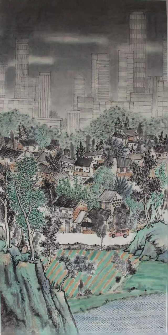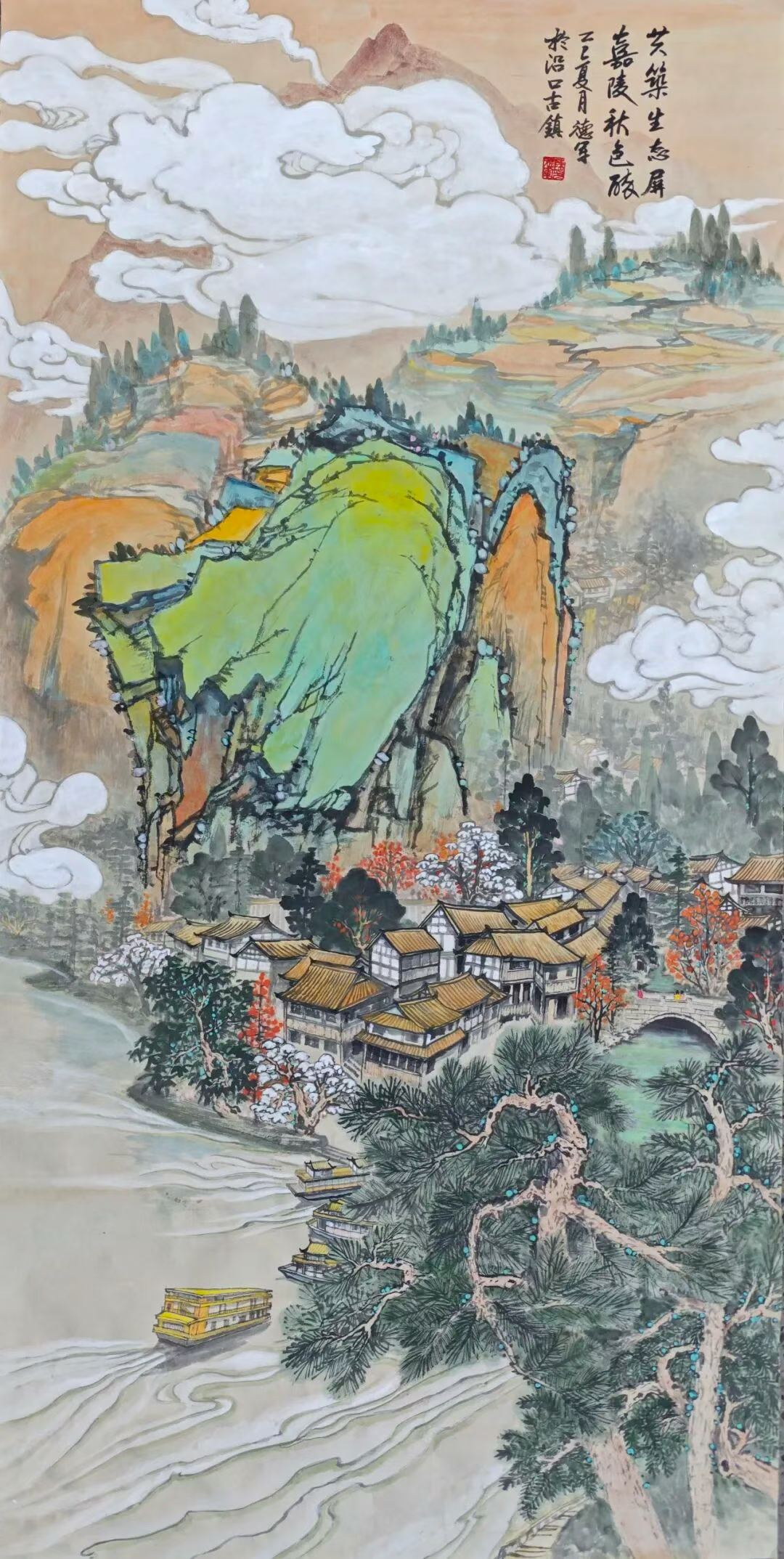 作品简介:作品以“绿水青山就是金山银山”为精神内核,以写意水墨重构城市与自然的共生图景。近景的沱江采用勾、染法表现,中景以汁绿与石青叠染传统民居与葱郁林带,远景以简练笔触勾勒现代城市轮廓,楼群似青山绵延,在氤氲云气中与古镇形成时空对话。通过传统城镇与现代都市依水共存的视觉叙事,传递“以水为媒”的可持续发展观。