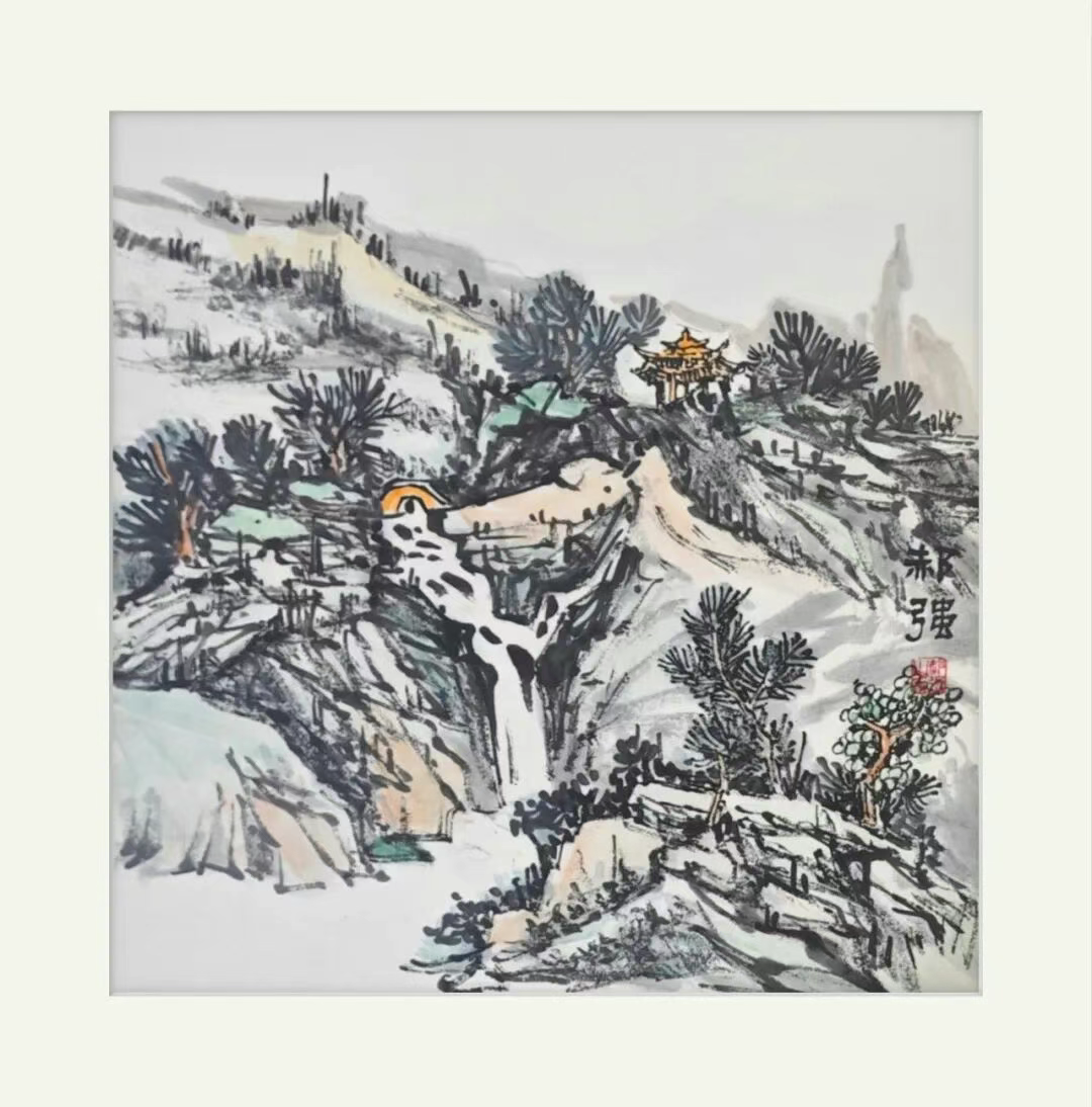 作品简介:《华蓥山下渠江清》以国画艺术形式表现,苍劲的华蓥山群峰,云雾中隐现游击队员身影;渠江如血带蜿蜒,衔接朝阳。江水、霞光与山花使用胭脂红,致敬《红岩》"血染渠江红"的悲壮。固有草堂记苦难,峰峦铸忠骨,一江血色照汗青。