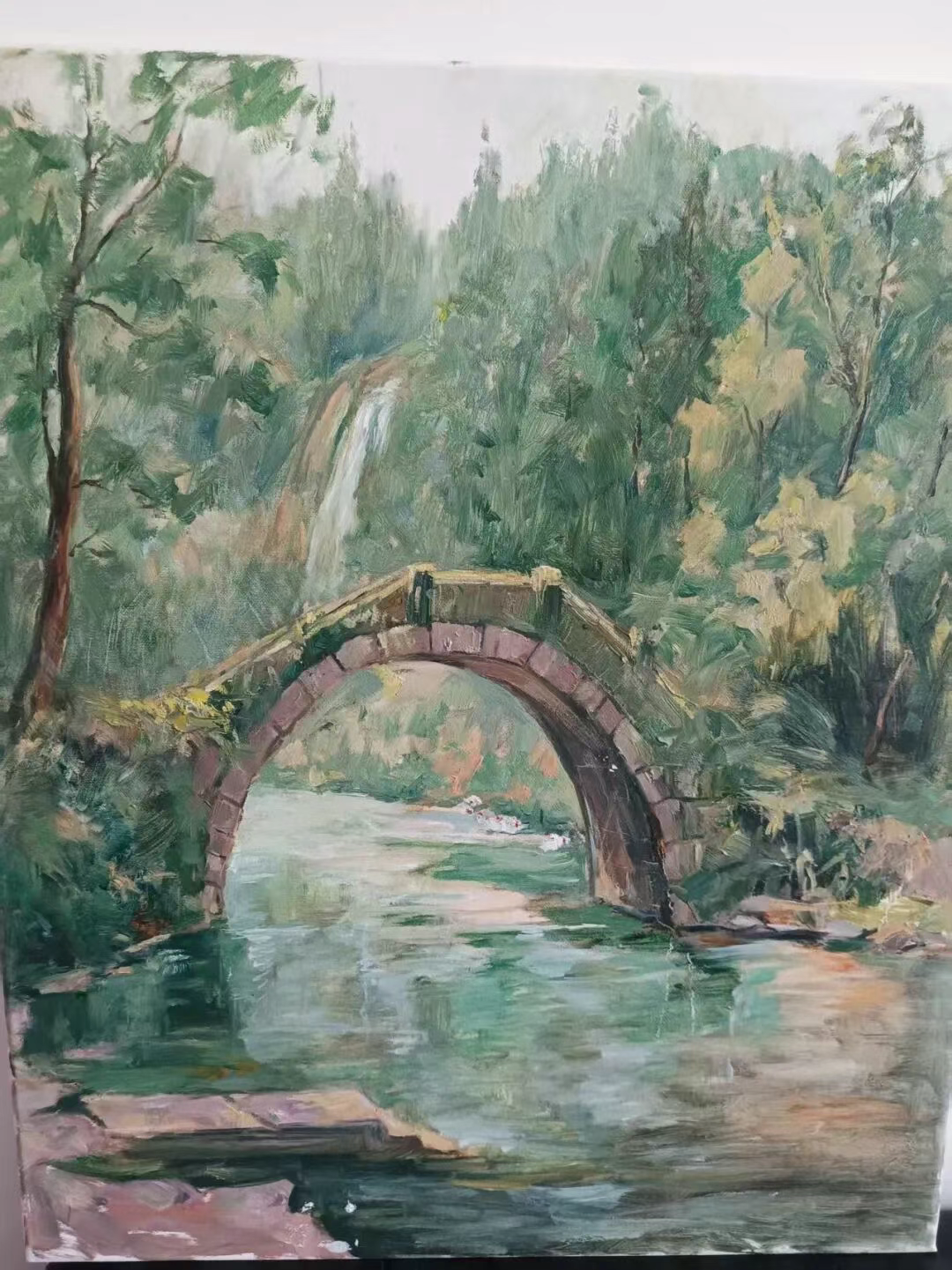 作品简介:这幅《翠谷流韵》油画,呈现的是渠江支流山水间石桥流水景致,借艺术笔触呈现生态治理硕果。在河长制守护下,溪流清澈,石桥静卧。两岸绿植繁茂,瀑布添灵动,展现生态治理让自然山水焕发生机,绘就人与自然相融的美好画面,是生态保护成果在艺术中的生动呈现 。