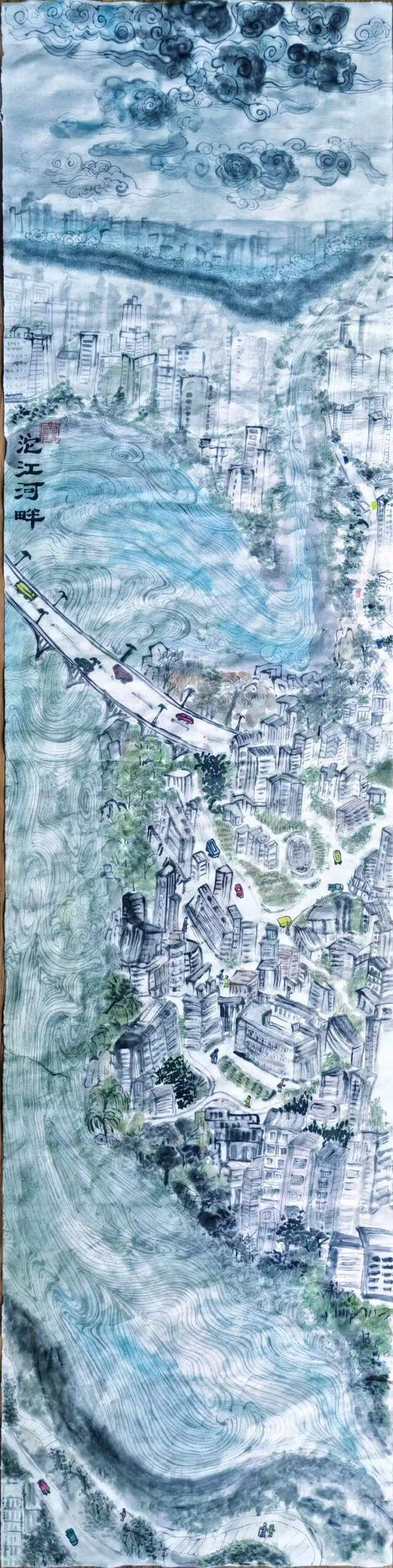 作品简介:《沱东河畔》以水墨长卷绘就城市风貌,从高空视角展现沱江东岸景致。蜿蜒江流穿城而过,桥梁横跨、建筑错落,城市轮廓与自然河道交融。创作者以细腻笔触勾勒建筑肌理、江水波纹,将现代都市的蓬勃与沱江的灵动相糅,呈现沱东河畔独特的地理与人文交融之美,记录这片土地的发展脉络与自然诗意。