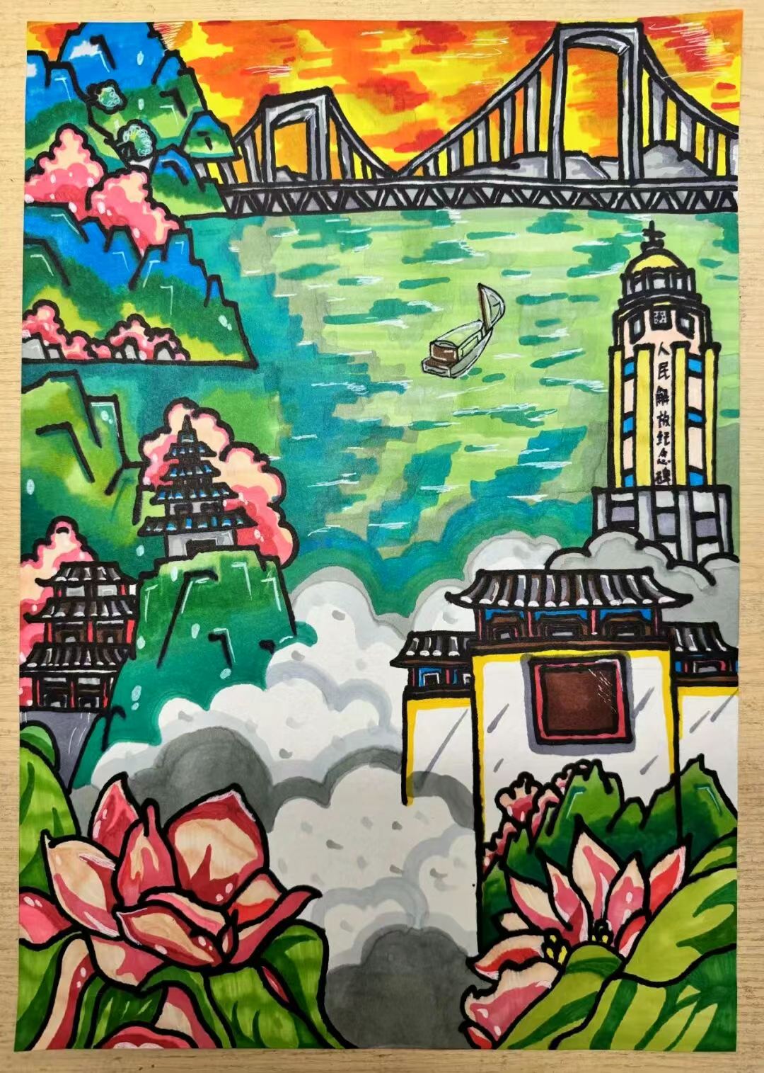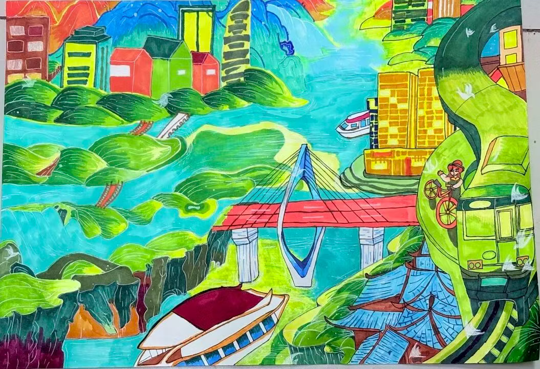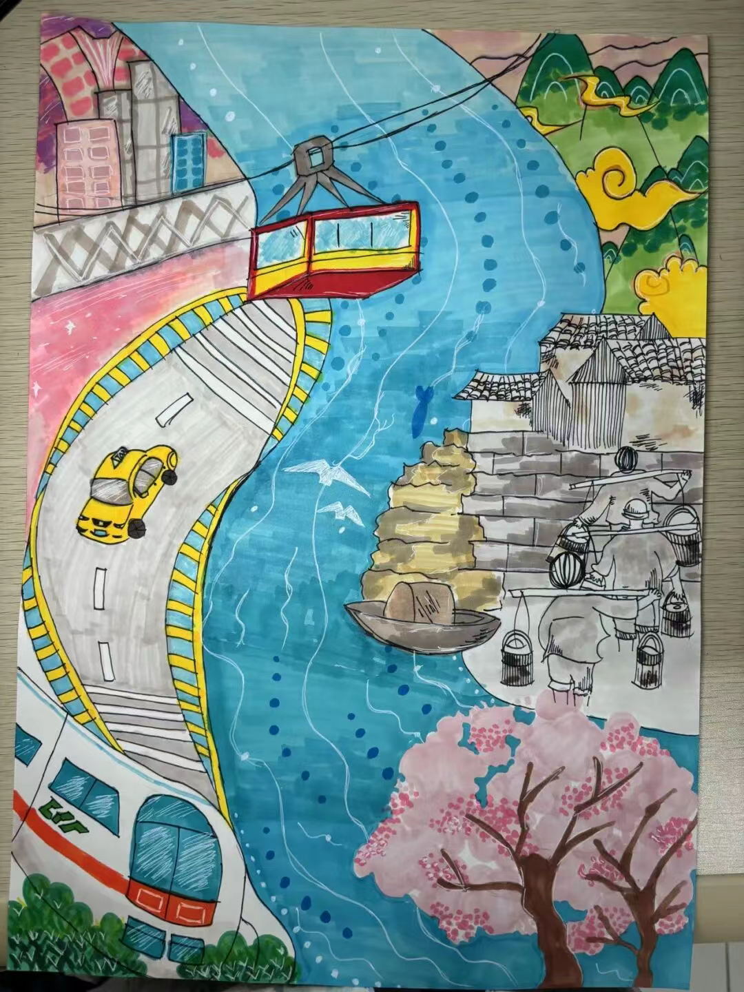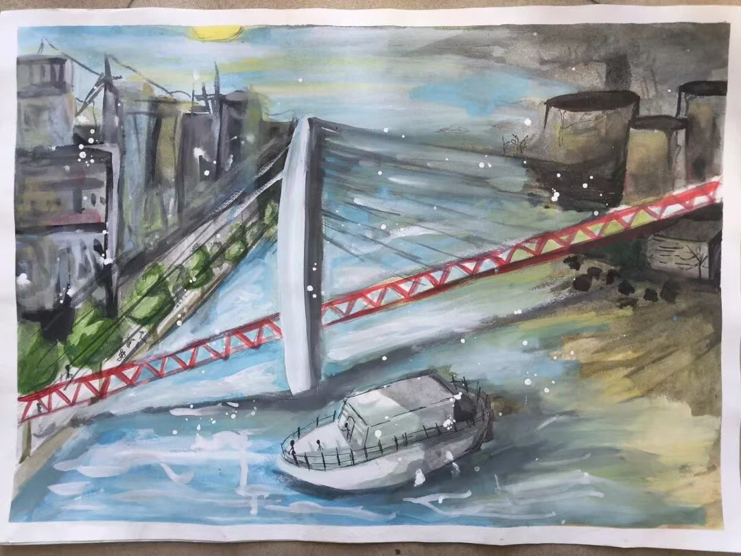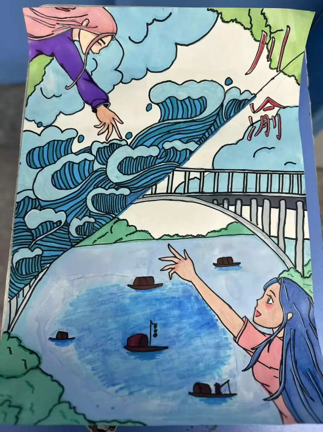 作品简介:画中呈现出的水域是以长江为主,桥以重庆标志性建筑千厮门大桥为原型,桥梁横跨、船只静泊,交织出人与自然的相依。而远方工厂排放的废水废气打破了这一份宁静,给城市带来了不属于的东西。因此,水域作为自然的“生命之源”,承载着许多不可替代的作用。我们应怀揣珍视之心,像呵护画中灵动水色一般,守护水库,让清澈水流永续,绘就人与自然和谐共生的美好长卷,留住这方纯净天地。