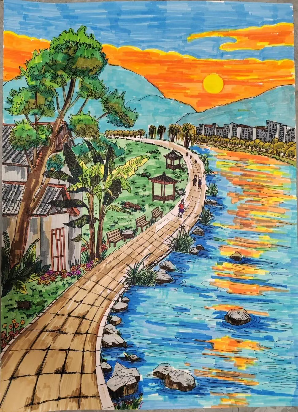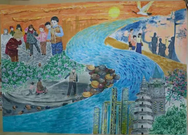 作品简介:这幅作品以斑斓的色彩和生动的笔触,描绘了人与自然和谐共生的美好画卷。画面中,清澈的河流蜿蜒流淌,岸边绿树成荫,鸟语花香,呼吁人们珍惜水资源、践行环保行动。整幅作品既展现河湖的生态之美,也承载着“人人参与、共护家园”的深切期盼,激发观者对自然的热爱与责任感。