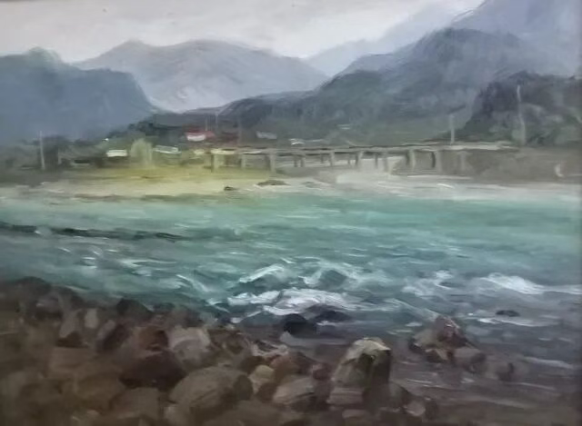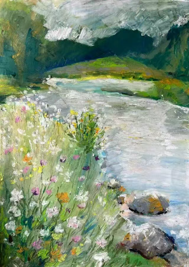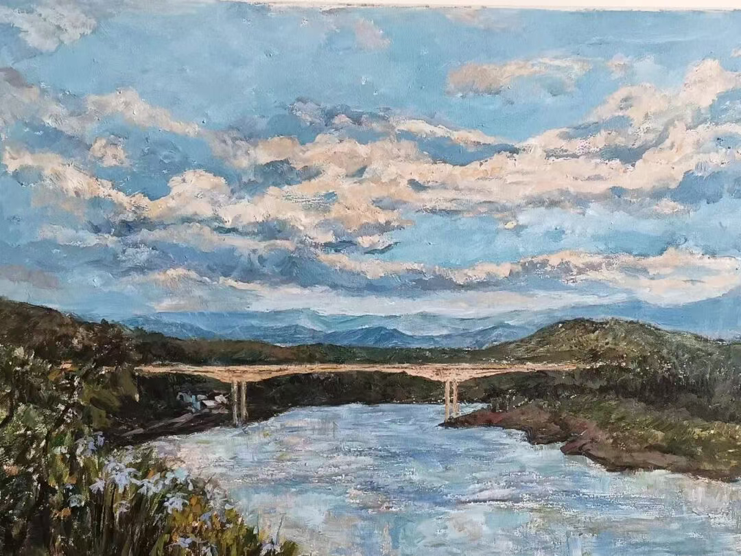作品简介:这幅油画描绘了春日故园河畔的生机。潺潺河水映着天光,粼粼流淌。一座静卧的桥连接两岸,是画面的焦点与纽带。岸坡上,初绽的野花与新绿的小草蓬勃生长,星星点点,随风摇曳,为河岸披上鲜嫩的春装。作品捕捉了春天特有的清新与活力,通过桥、水、花草的和谐构图,传递出家园的宁静、温暖与自然万物复苏的喜悦,是一曲献给春日故园的视觉诗篇。