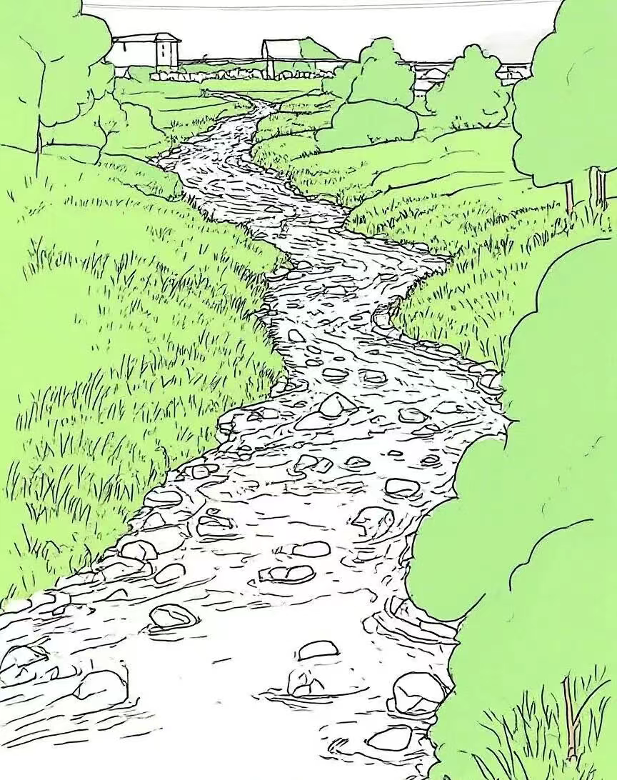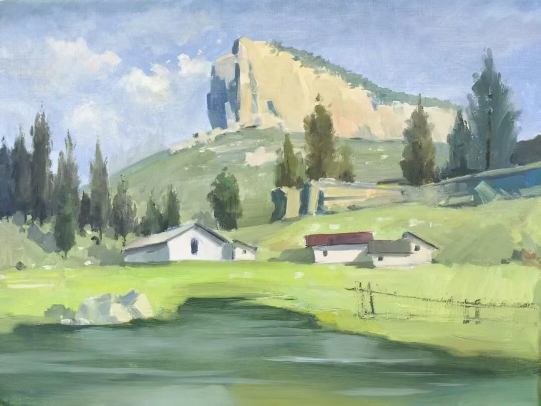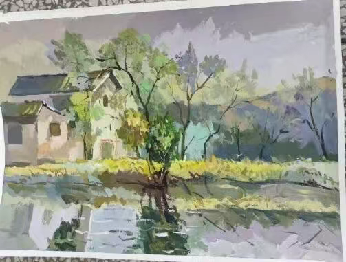 作品简介:本作品以河流为视觉中心,碧水如镜,倒映天光山色。河畔绿草如茵,几间屋舍错落,背后青山巍峨、林木葱郁,天空白云点缀。色彩明快,笔触简洁,借河流串联起田园景致,营造出静谧悠然的乡村氛围,尽显自然之美。