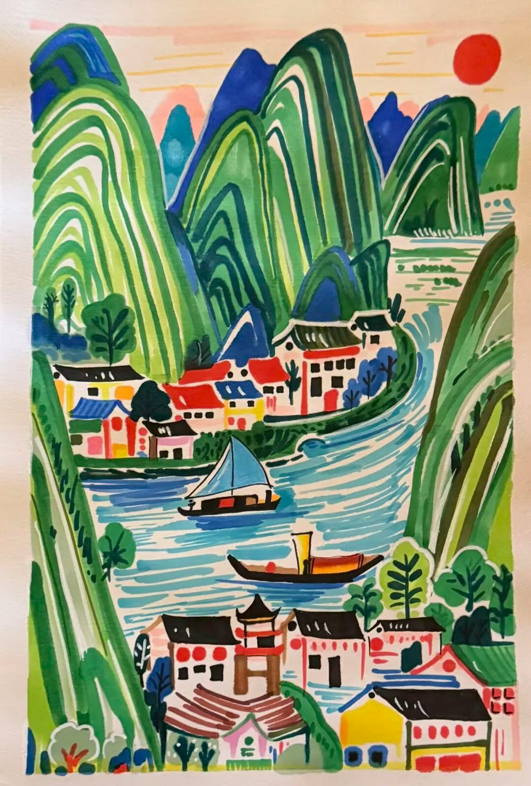作品简介:这幅画展现了美丽的乡村风光:蜿蜒的河流穿村而过,两岸绿树农田相映成趣。河面上,几艘小船悠然行驶,农民劳作其间。画面下方,三位农民面带微笑,挥手致意,庆祝丰收。上方的文字“共饮一江水共建幸福河”寓意深远,表达了人们对和谐生活的向往。整幅作品色彩鲜明,生机盎然,传递出乡村的宁静与和谐之美。