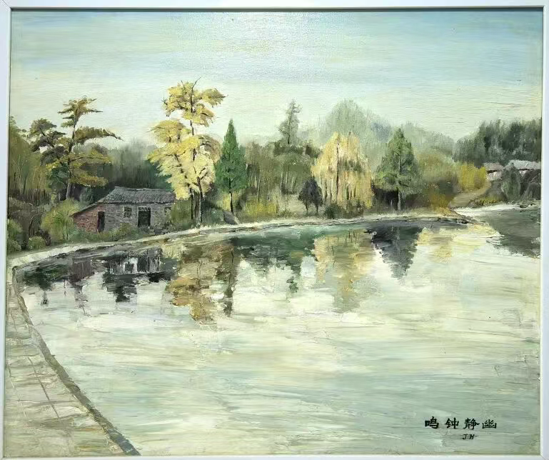 作品简介:《鸣钟静幽》,布面油画,60×70cm,画于2024年10月27日。绘画位置:四川省武胜县鸣钟乡长滩寺河段。绘画天气:阳光明媚,有微风。
