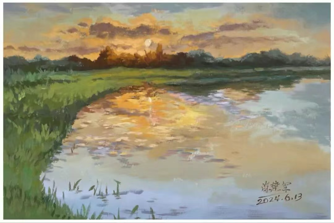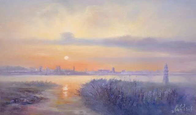 作品简介:《沱东印象》以细腻油画笔触,勾勒黄昏时分沱东景致。落日熔金,余晖洒在江面,城市轮廓在朦胧中若隐若现,近景草植晕染出淡紫层次。画家捕捉这一瞬的温柔光晕,将自然与城市交融,留存沱东独有的日暮诗意,让观者沉浸式感受这片土地黄昏时的静谧与浪漫。