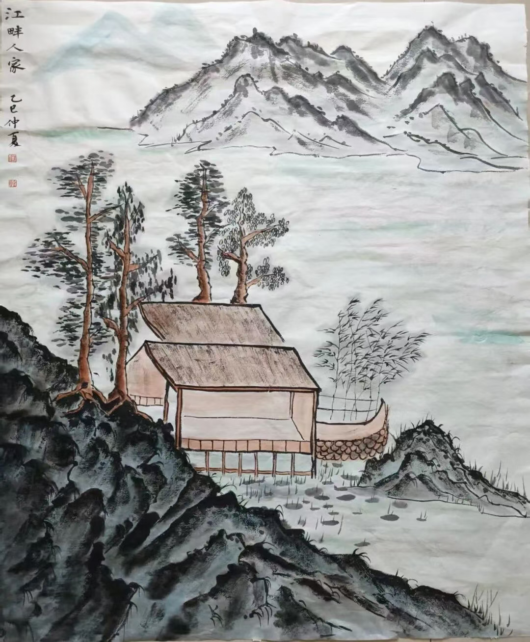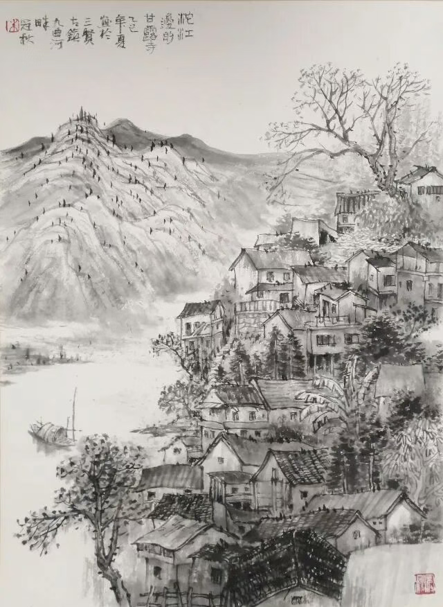 作品简介:此幅《江畔人家》国画以渠江为蓝本,以水墨为骨、色彩为韵,勾勒出江畔人家诗意图景。画面以淡墨渲染山峦,云雾缭绕间,既表现出山水的空灵悠远,又与近景形成虚实相生的艺术效果。凸显了河长制守护河道生态的责任与担当,唤起大众对生态环境保护的关注与重视,共同守护绿水青山,共建人与自然和谐共生的美丽家园。