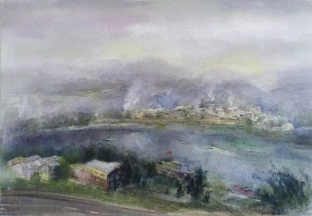 作品简介:《资阳野人滩》以水彩绘就资阳江畔景致,画面中,远山朦胧含黛,江面波光与薄雾交融,村落错落、舟楫点缀。创作者借轻柔笔触与淡雅色调,将野人滩的宁静与资水流域的烟火气息相糅,展现这片土地的自然韵致与人文底蕴,让观者透过朦胧水色,感受资阳江畔独特的诗意与生活温度。