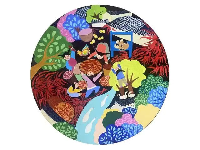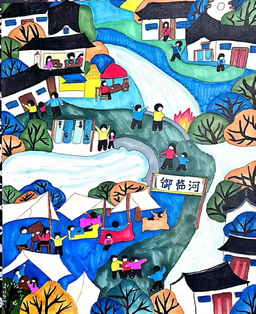 作品简介:这幅画作围绕“共饮一江水,共建幸福河”主题,生动呈现了御临河畔的美好生活场景。河水蜿蜒,穿村而过,赋予村庄灵动与生机。河边,人们或是惬意露营,或是自在活动 ,屋内亦有温馨相聚的画面。 色彩明快丰富,展现出河流滋养下的幸福生活,同时也呼吁大家携手守护御临河,维护这份美好,让幸福之河长流不息。