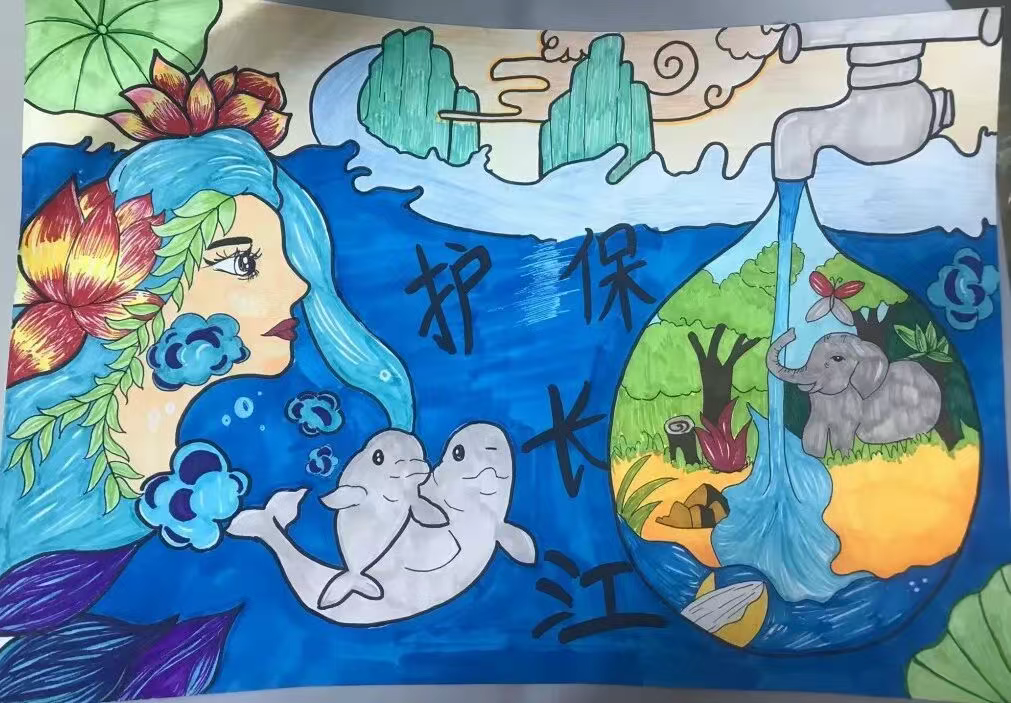 作品简介:这幅作品展现了长江生态之美与保护意义。画面中,灵动的江豚在水波间嬉戏,它们是长江生态系统的珍贵成员,象征着长江水域蓬勃的生命力。头戴花环的女性形象,柔美而富有生命力,寓意着长江如母亲般滋养万物。右侧独特的水龙头与水滴造型区域,勾勒出陆地的动植物景观,展现长江水源对整个生态系统的润泽。呼吁大众关注长江生态现状,警惕水污染、生态退化等问题,携手守护长江这一生命的摇篮,让长江的生态之美永续流传。