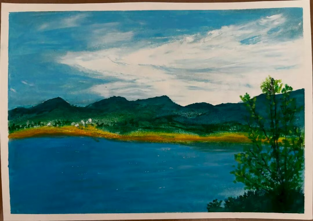作品简介:这幅水彩画展现宁静自然风光,蓝天缀白云,湖面如镜,倒映天地与岸边葱郁林木。笔触轻盈,色彩清新,以简洁明快的构图,传递出闲适静谧氛围,让观者仿若置身这方悠然天地,暂忘喧嚣,沉浸于自然之美与平和之中。