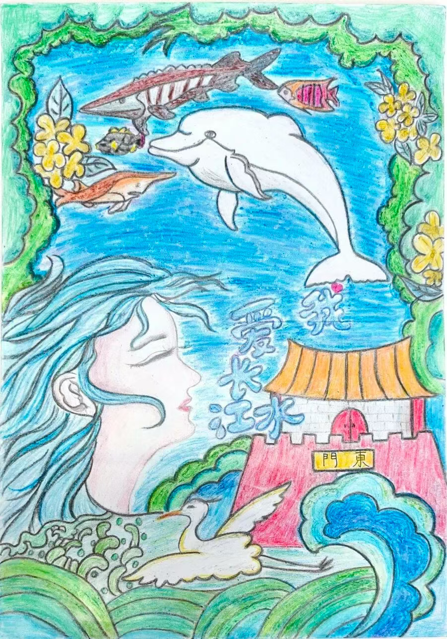 作品简介:此绘画作品紧扣“川渝河长制五周年”主题,从展现长江生态保护成果落笔,图中以女性代表美丽的长江母亲,下方白鹭和上方白鳍豚、中华鲟代表经过长江生态保护,长江生态环境得到极大改善,珍稀物种又出现在长江生态圈。画面以天的蓝、水的绿“蓝绿色”为主色调,突出山更青、水更绿,四周点缀泸州市花——桂花,右下方是泸州长江地标性建筑“东门口”城楼,凸显泸州特色,背景与主体相呼应,把握了画面的平衡感。集中体现泸州在长江生态环境保护上所取得的显著成效。