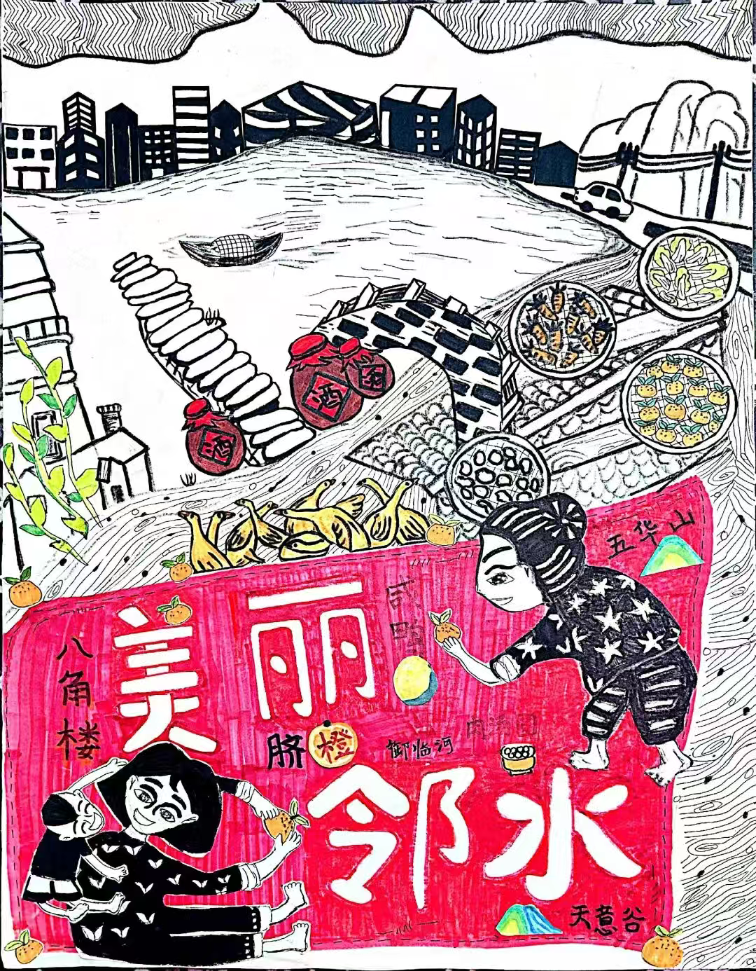 作品简介:《美丽邻水》用丰富元素展现邻水风貌。展现了邻水对河道治理建设的良好成果,画面主要表现邻水的山水,其次还有 “酒” 罐、果蔬等,人物生动,“美丽邻水” 字样醒目。将邻水的地标(八角楼、御临河等 )、物产(脐橙 )融入创作,以独特视角呈现家乡的风土人情与魅力,传递对邻水的热爱。