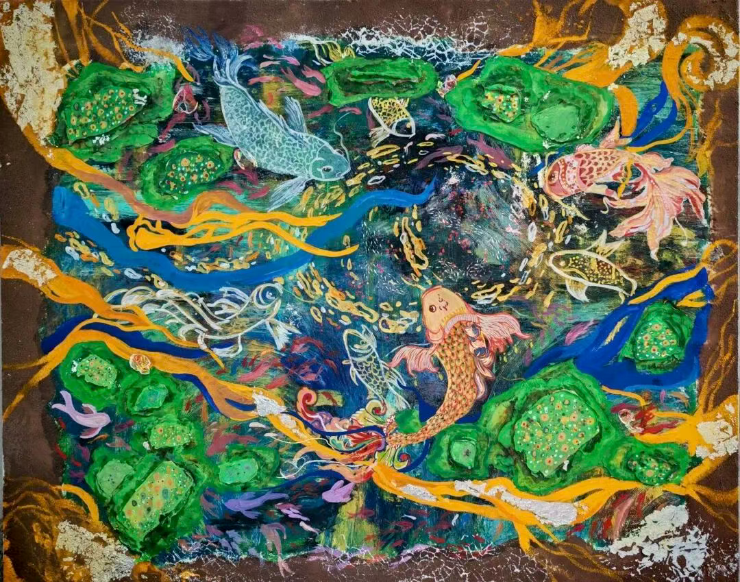 作品简介:以综合材料绘画解构,金色水波荡漾出跨界河流的地理脉络,层叠树脂凝结碧波治理的切片,荧光星辰在锦鳞中闪烁成生态修复的年轮。三条渐变色锦鲤自漩涡中心腾跃,橙红鱼首铭刻文化记忆,星紫鱼身漫射产业转型的虹彩,游弋的小鱼群化作沿岸百姓的笑颜。指纹沟壑既是江河治理的合力轨迹,亦是两地共绘生态蓝图的同心纹。