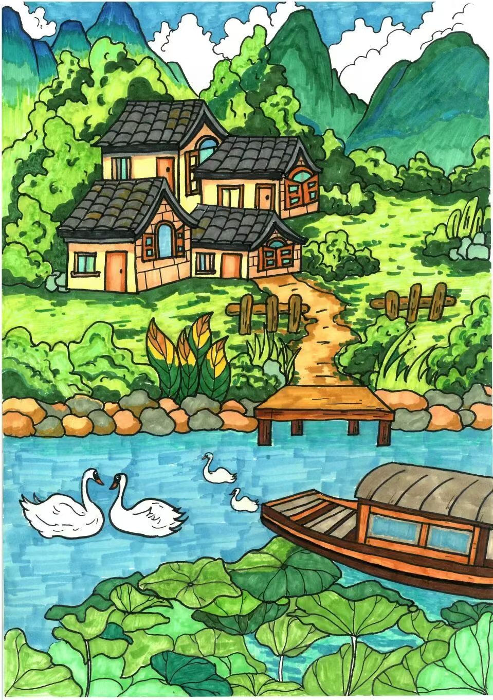 作品简介:这幅画展现了人与自然和谐共处的美好场景。清澈小溪穿园而过,孩子戏水、垂钓,鸟儿相伴,周边 “保护环境 人人有责” 等标语,传递守护青山绿水、营造美好家园的环保理念,用童真视角呼吁爱护自然。