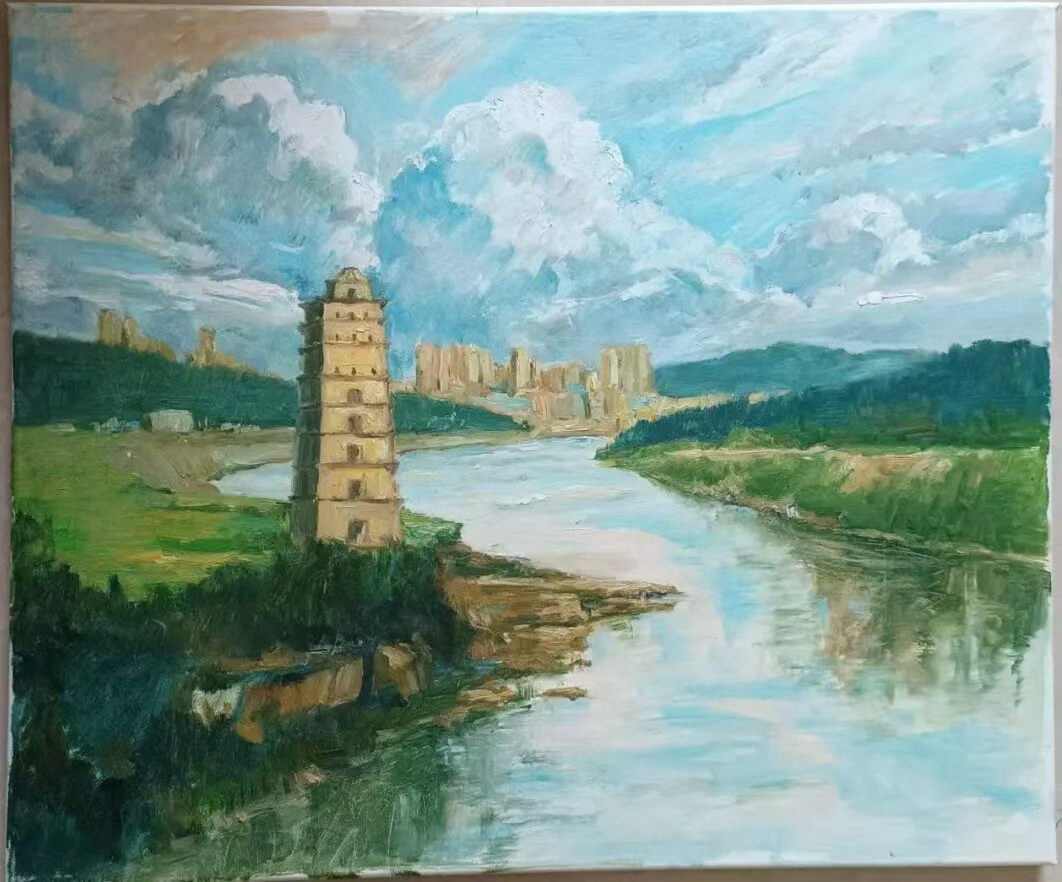 作品简介:这幅《渠江白塔公园》油画,呈现河畔古塔静立景致。得益于河长制治理,渠江水清岸绿,倒映蓝天白云与城市轮廓。历史古韵与生态新貌交融,展现河长制守护下,渠江生态之美,绘就人与自然和谐共生的诗意画卷,见证治理成效与时光沉淀的温柔。
