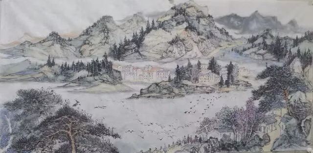 作品简介:作品以传统山水笔法绘就,展现古渡风貌。画面中,山水相依,古渡遗韵与现代元素(如岸边摩托)交融。灵感源于对岁月流转、古今对话的思考,借山水之形,传古渡历史厚重与当下生机。以水墨淡彩晕染,勾勒山峦、树木、舟船,力求在传统意境里,呈现时光沉淀后的鲜活与静美,让观者于古渡景致中,感受历史延续与时代脉动。