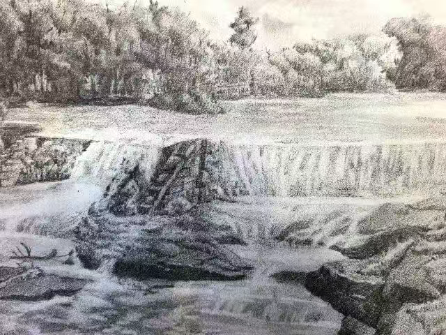 作品简介:龙洞河五里分支,这幅绘画中,蜿蜒的溪流在山谷间流淌。溪水清浅见底,形态灵动自然,沿途的石块错落有致,溅起层层水花。两岸草木葱茏,雾气朦胧,渲染出静谧悠远的氛围。简单的线条勾勒出河流的神韵,展现出山野间独特的生机与诗意,宛如一首流淌的自然赞歌。