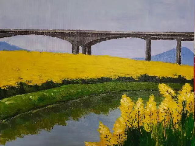 作品简介:作品是以初春时节沱江河畔油菜花开为主题的丙烯画作品。沱江河水悠悠流淌,如一条碧绿的丝带蜿蜒穿过画面。河畔两岸的油菜花竞相开放,在微风中轻轻摇曳,湖中倒影的油菜花,仿佛泛起的层层金色波浪,远景的天空湛蓝如宝石,中景的灰白色高架桥巍然屹立与近景一大片一大片的黄色油菜花共同构成了一幅色彩明丽的春日画卷。