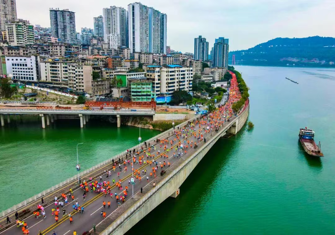 作品简介:马拉松选手在江边奔跑,伴随着江风,富有韵律之美;既展现了江边的生态景色,又体现了川渝的人文特色,通过马拉松赛事将两者融合呈现。