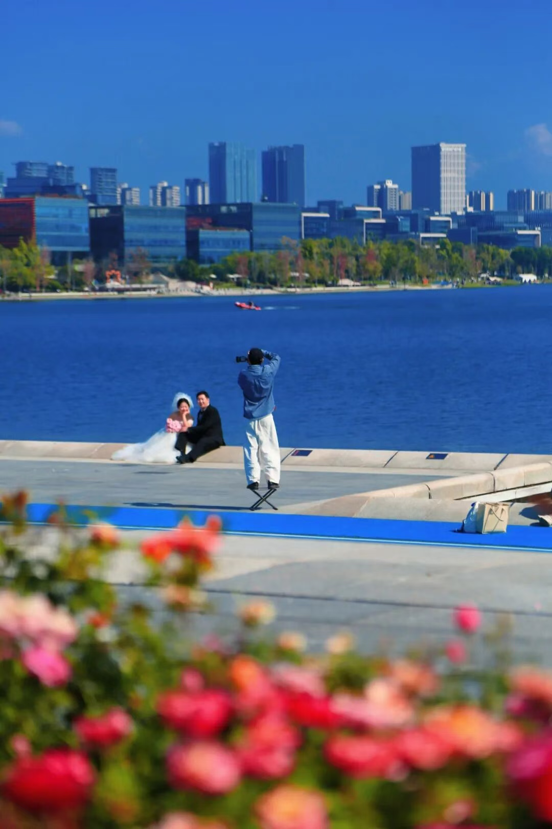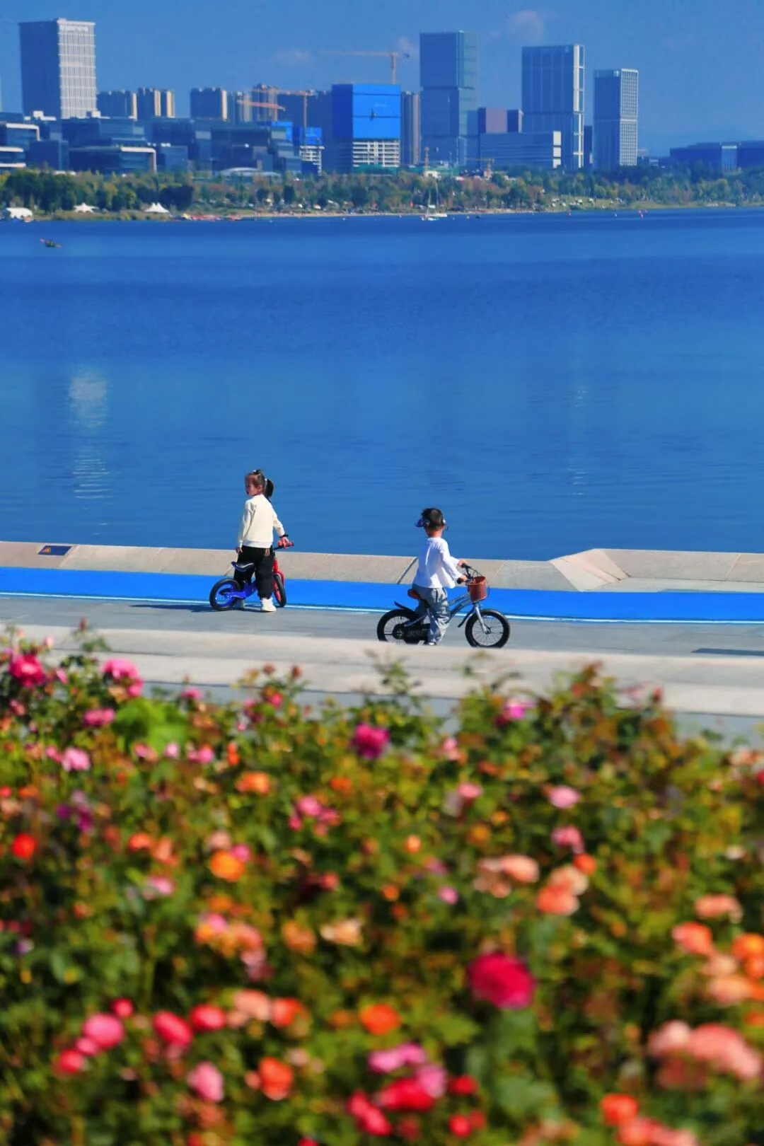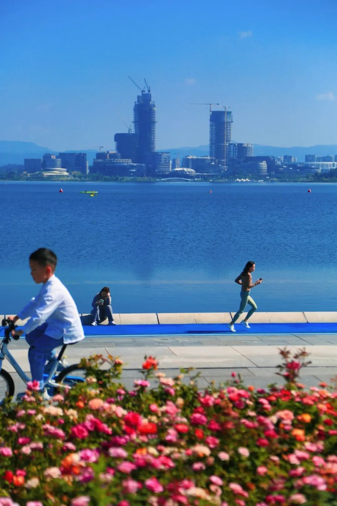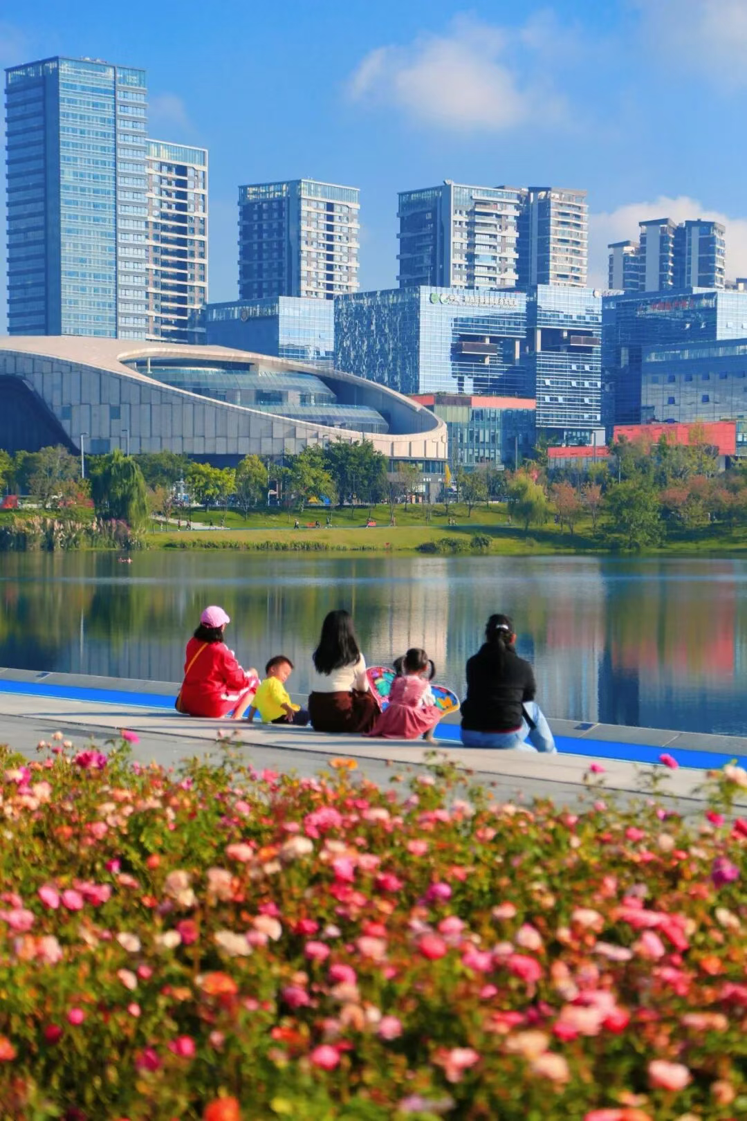 作品简介:作品聚焦城市湖岸景致,以“花”为自然符号,“海(湖)”串联场景,捕捉人们在自然环境中的生动日常:孩童骑行、家人休憩、新人定格幸福、市民运动休闲 。花朵盛放点缀前景,湖水如镜倒映蓝天与建筑,自然景观与城市人文交融。画面里,人们与繁花、湖水、建筑和谐共处,展现出自然滋养生活、人文点亮自然的美好图景,传递出城市中人文与自然共生共荣的温馨氛围 。