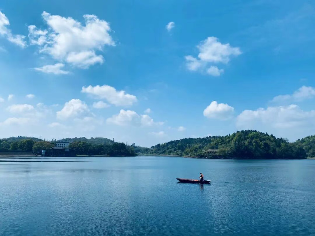 作品简介:这幅作品拍摄于岳池县响水水库。远山如黛,苍穹之上,流云舒卷,将天空的辽阔温柔地折叠,水天一色的画卷里,仿佛云与水在轻声对唱,一叶扁舟悄然入境,唯有它的存在道尽了永恒的静谧与孤独的诗意...