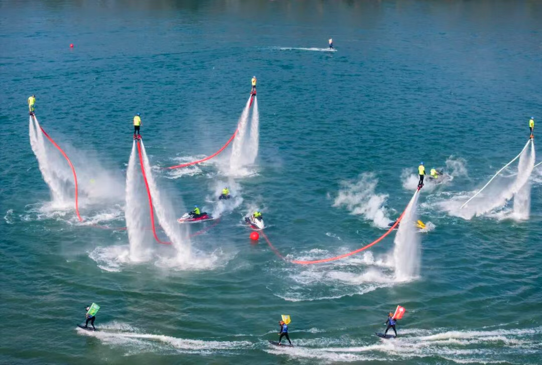 作品简介:在湛蓝清澈的沱江水面,一场精彩的水上运动项目开业活动正在上演。飞人运动员脚踩水上飞行器,身着蓝帽黄衣,在水面上腾空而起,激起洁白的水花,三艘浆板船滑翔而过,划出一道道优美的弧线。他们身姿矫健,动作整齐划一,而又不失灵动,与碧波荡漾的江水相映成趣,展现出了水上运动的独特魅力与活力,为沱江增添了一抹绚丽的色彩。