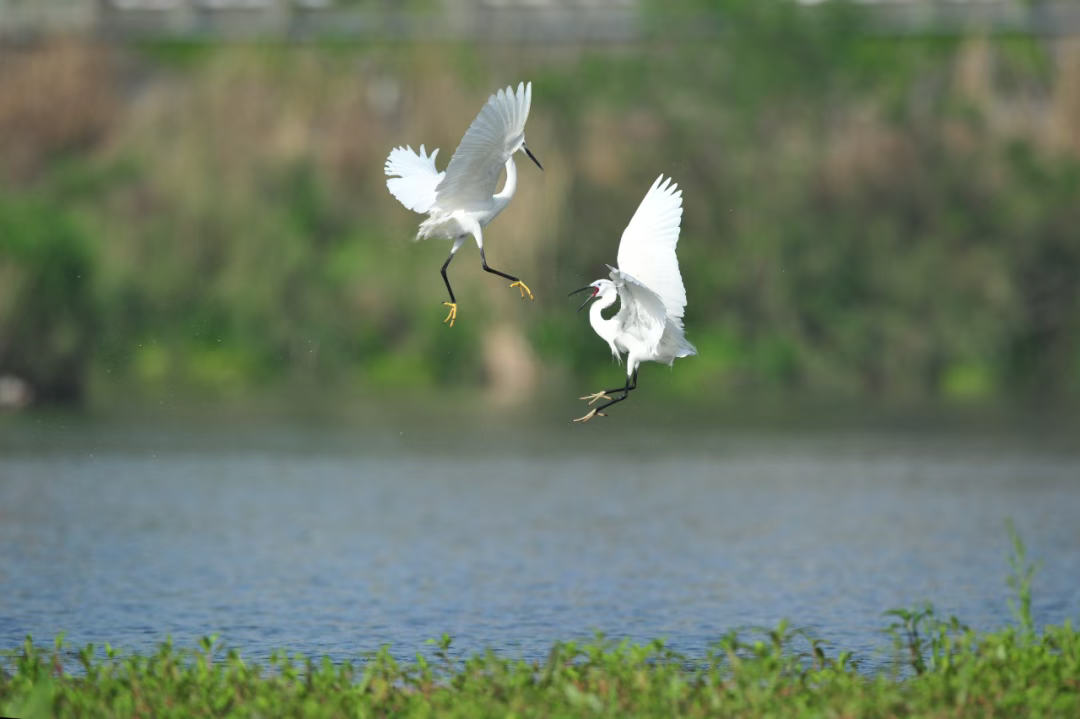作品简介:在美丽的花溪河畔,良好的生态环境让白鹭生活的自由自在。晴日下,碧水畔,两只白鹭似灵动的雪羽精灵,它们舒展白羽,在水光潋滟间翩然起舞,在天地间勾勒出纯真嬉戏的模样;它们以风为律,以水为台,振翅、回旋,搅起的风里,裹着水草的清香,把平凡的自然场景,晕染成诗意满溢的灵动篇章。