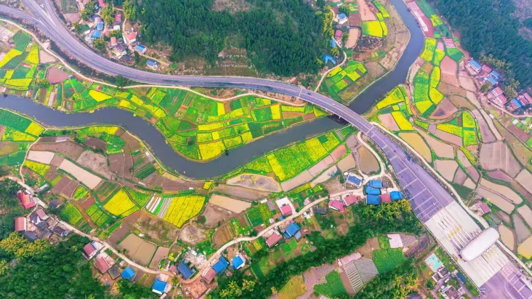 作品简介:2025年3月8日,油菜花盛开时节,蜿蜒的岳阳河穿过色彩斑斓的农田,高速公路跨河而过,连接着分布在田野间的村落,乡村生态与交通基础设施的融合,构成美丽的田园景致。