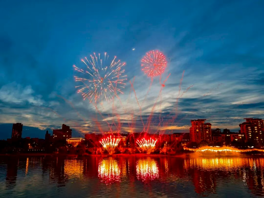 作品简介:随着夜幕降临,湖水在微风中泛起层层涟漪,如同一幅被轻轻揉皱的绸缎。紧接着,烟花瞬间点亮夜空,光芒与湖水共舞,绘就一幅绝美的夜湖盛景图。